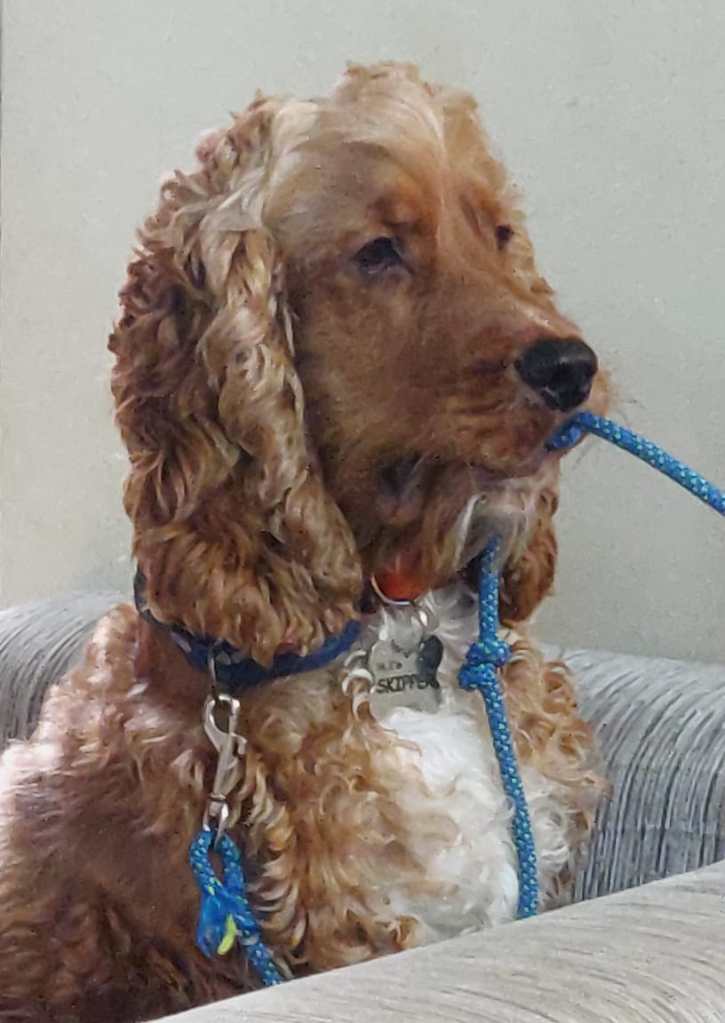 As I come to the end of this doggie tale, I look at him. He is stretched out near my chair. Those melting eyes look up and the tail wags gently. He stands up, stretches and bends elegantly. Then the fervent shaking of the head and flapping of those drooping ears. It’s Skipper time.
